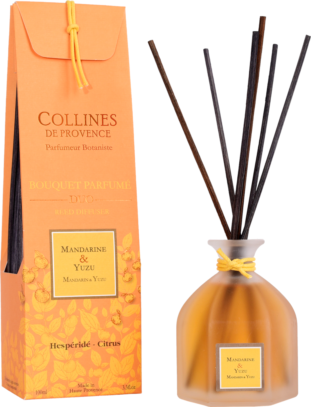 Die Collines de Provence Duftstäbchen Mandarine und Yuzu verwandeln Ihre Wohnräume in eine Oase der Sinne. Das hochwertige Parfum in elegantem Glasflacon durchdringt die natürlichen Rattanstäbchen und verbreitet über mehrere Wochen hinweg einen subtilen, fruchtigen Duft.