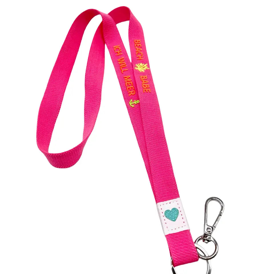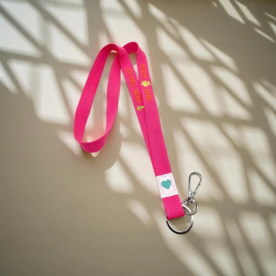 Das breite Textilband sitzt angenehm und sorgt für optimalen Tragekomfort – ob am Strand oder im Alltag. Schlüssel befestigen Sie einfach am runden Schlüsselring, Karte oder Smartphone hängen Sie über den stabilen Karabiner. Mittellang und handlich zugleich: Das ist die perfekte Kombination aus Funktionalität und Design, die Ihren Alltag wirklich erleichtert.