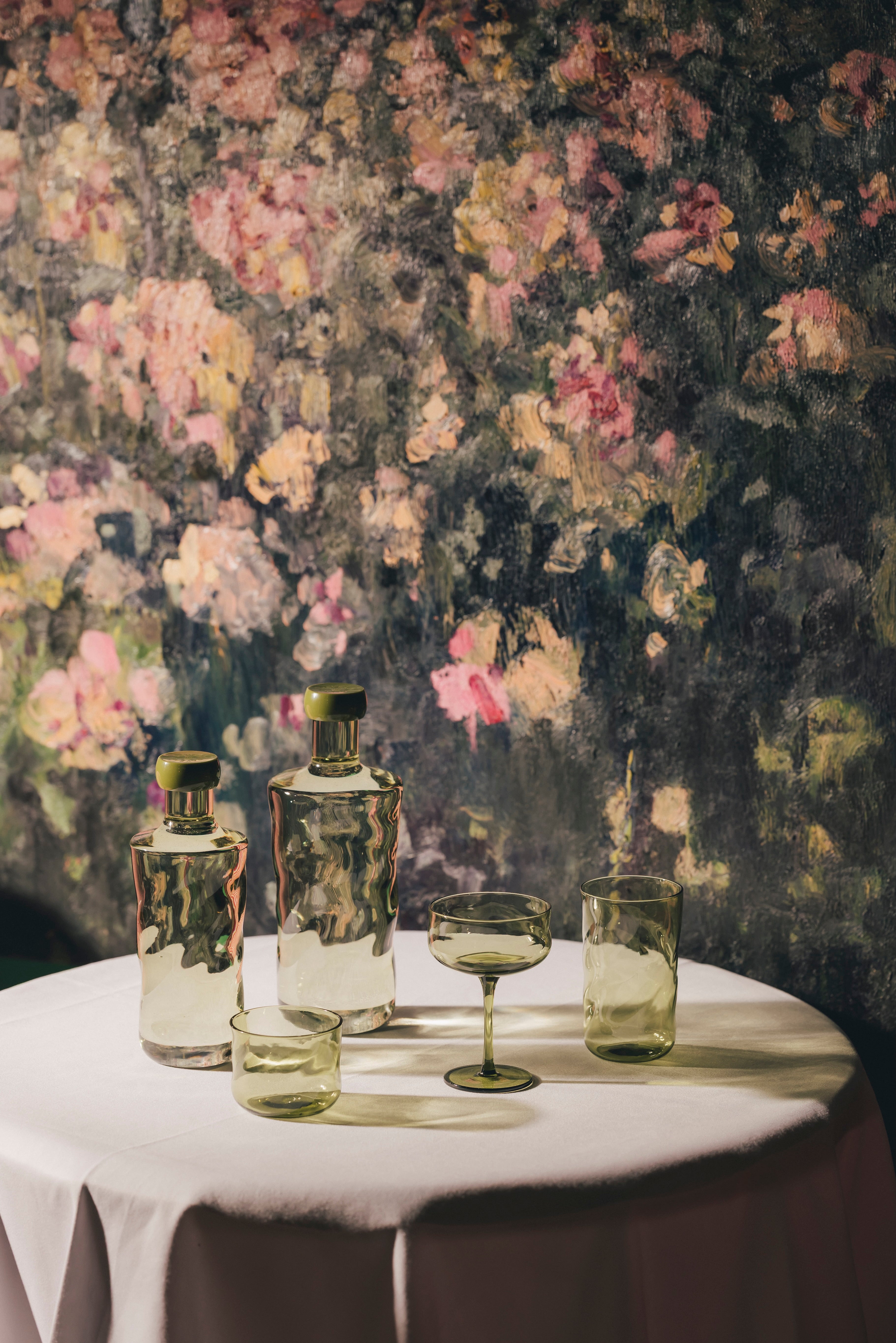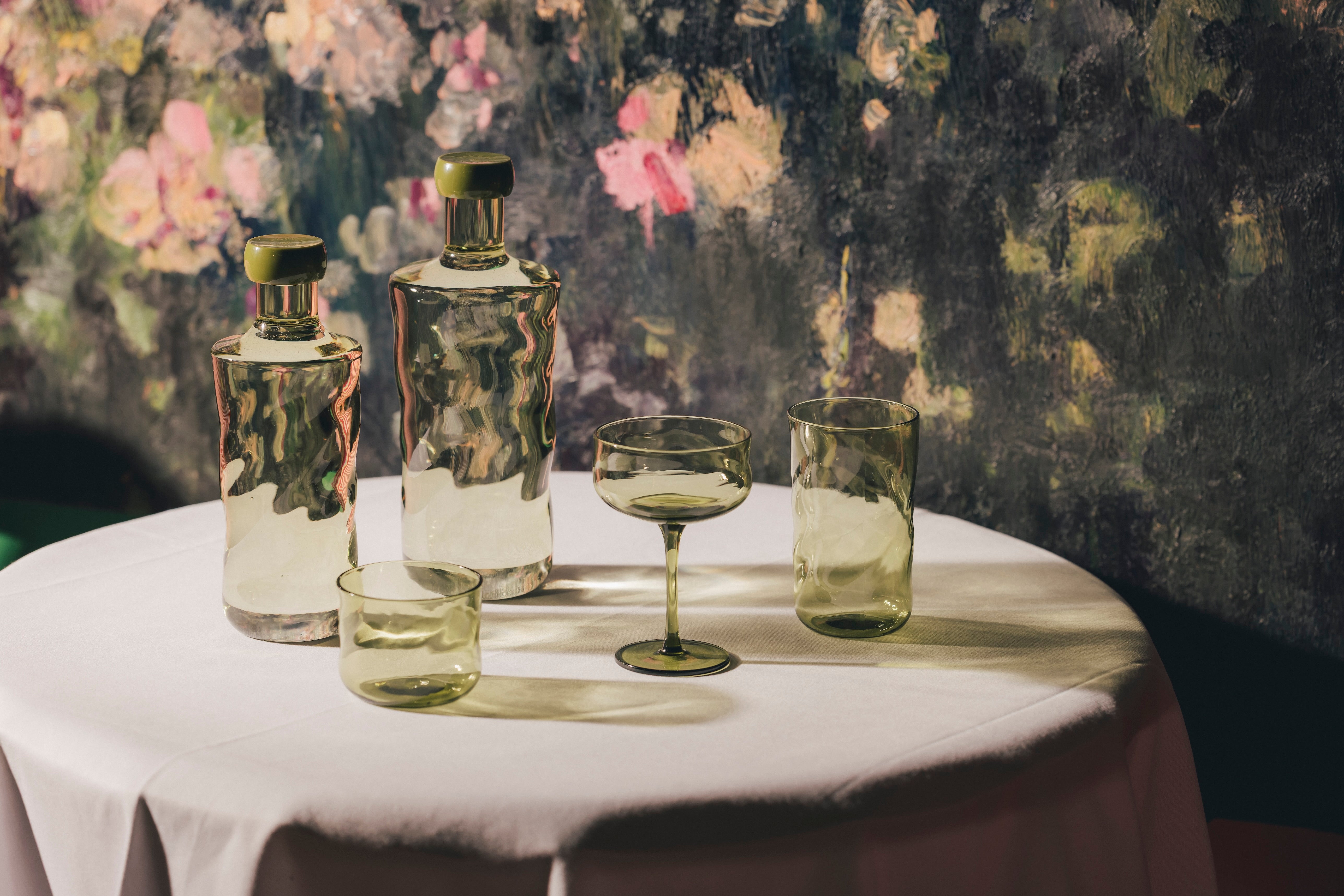 Entdecken Sie die mundgeblasene Paveau Flasche Swirl – eine Hommage an die Schönheit des Wassers mit seinen organischen Linien, die perfekt in modernes Interior-Design passen.