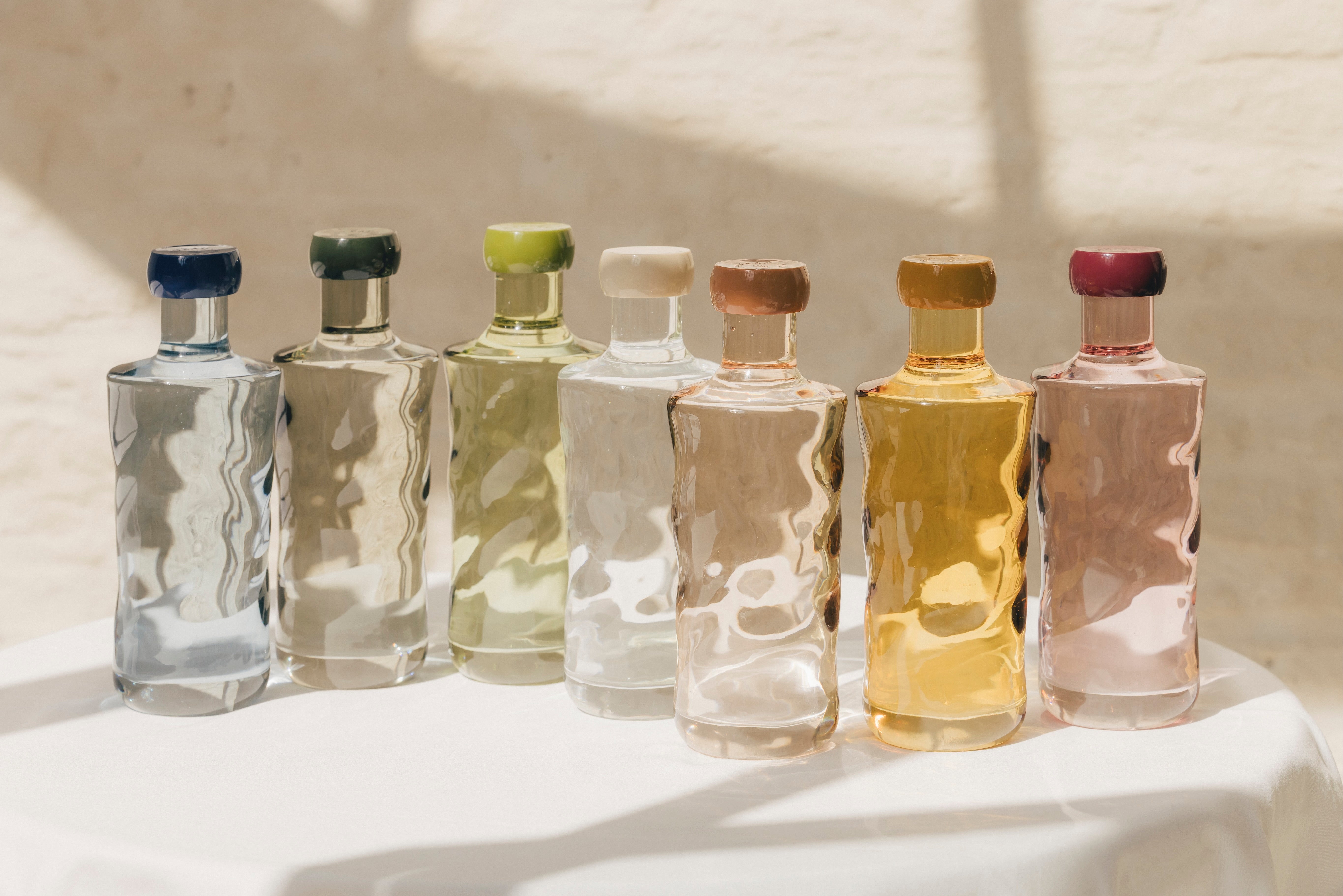Entdecken Sie die mundgeblasene Paveau Flasche Swirl – eine Hommage an die Schönheit des Wassers mit seinen organischen Linien, die perfekt in modernes Interior-Design passen.
