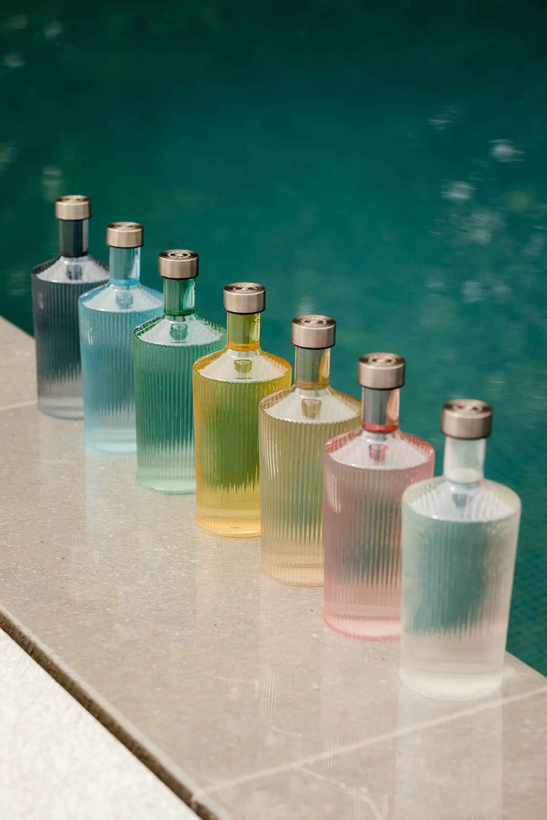 Kombinieren Sie die Flasche mit farbigen Gläsern für einen lebendigen und nachhaltigen Look.