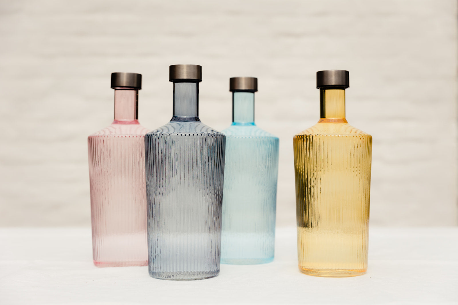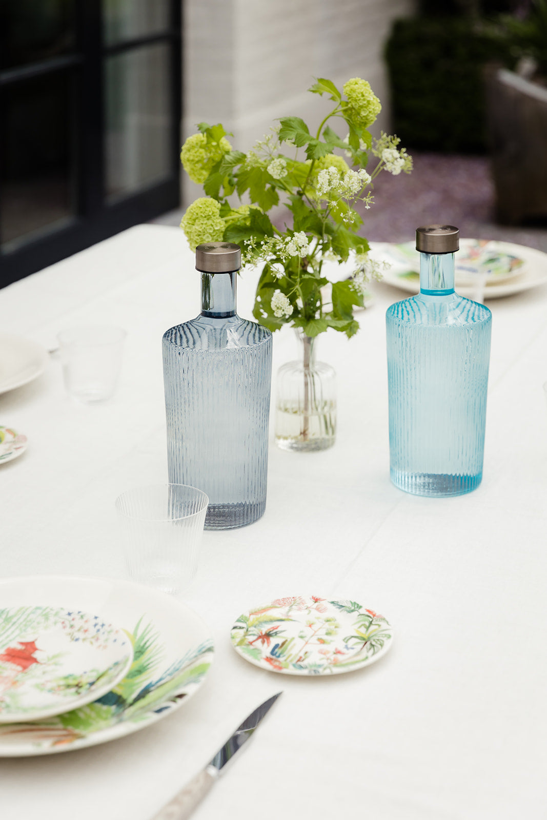 Kombinieren Sie die Flasche mit farbigen Gläsern für einen lebendigen und nachhaltigen Look.