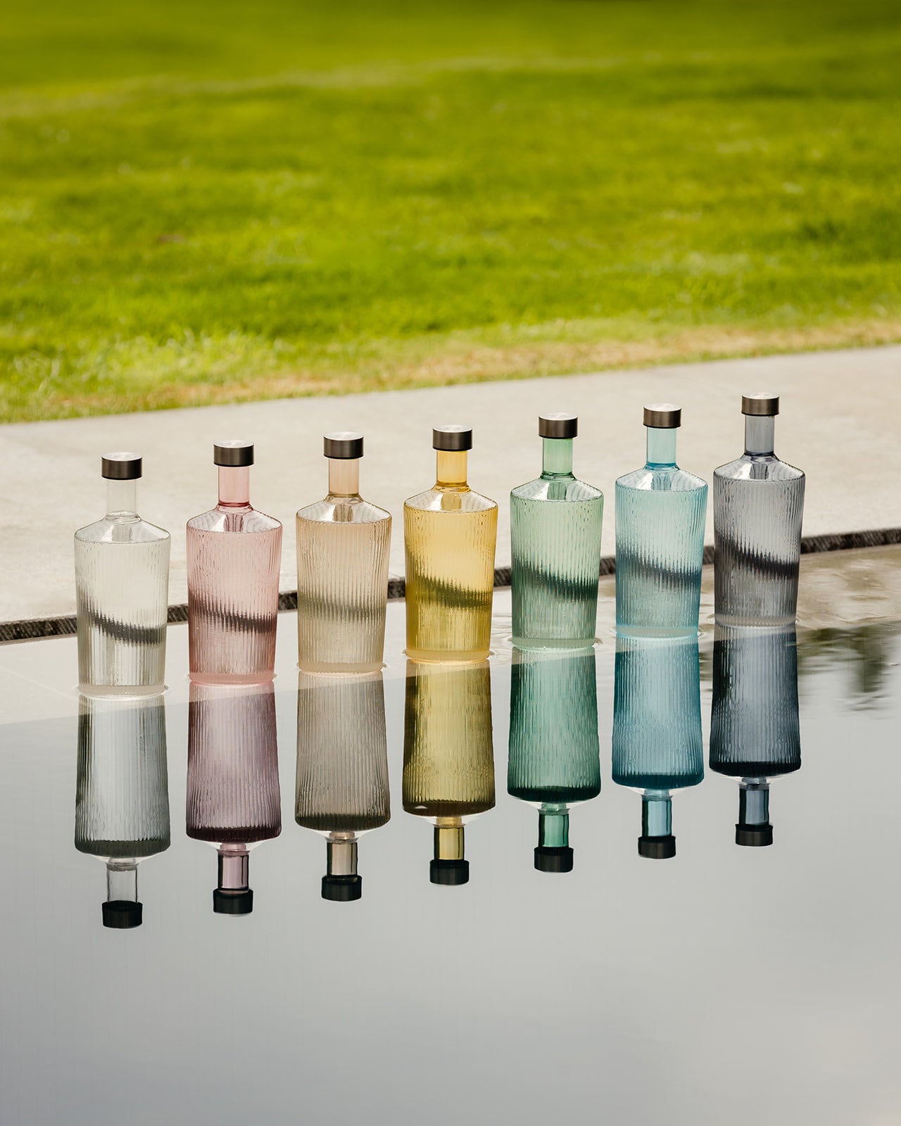 Kombinieren Sie die Flasche mit farbigen Gläsern für einen lebendigen und nachhaltigen Look.