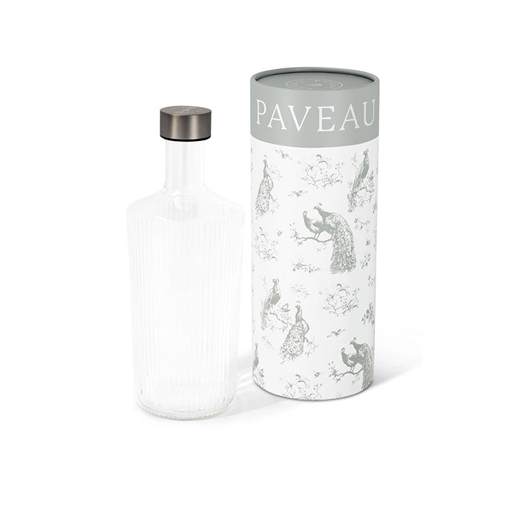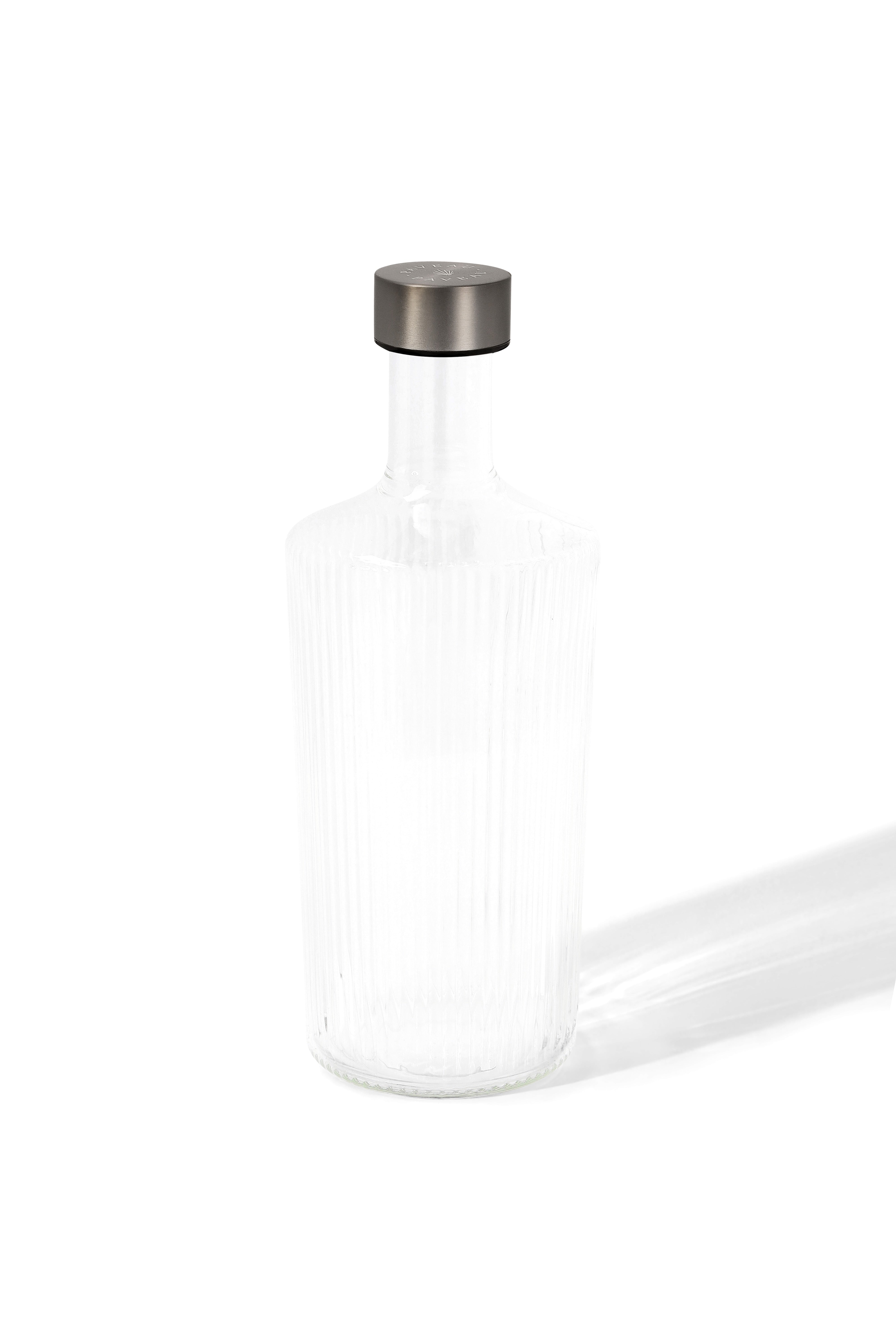 Die Wasserflasche der belgischen Marke Paveau ist ein ästhetisches Accessoire für jeden gedeckten Tisch, denn sie vereint Design und Nachhaltigkeit auf geschmackvolle Art und Weise. Das mundgeblasene Glas und ihr feines Rillendekor, das an edle Spirituosenflaschen erinnert, machen sie zu einem stilvollen Begleiter auf Ihrem Tisch. Der praktische Metall-Schraubverschlusses verhindert das Entweichen von Kohlensäure.