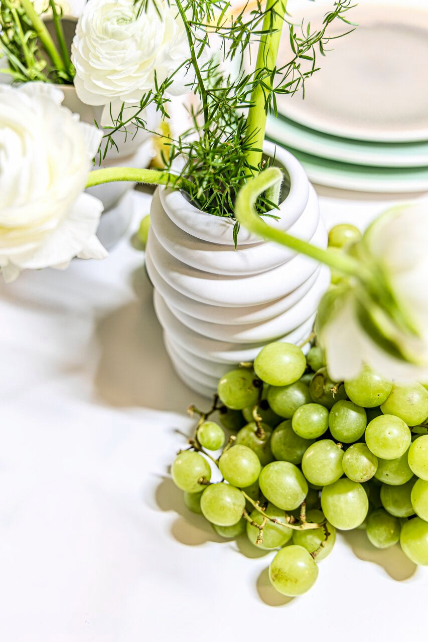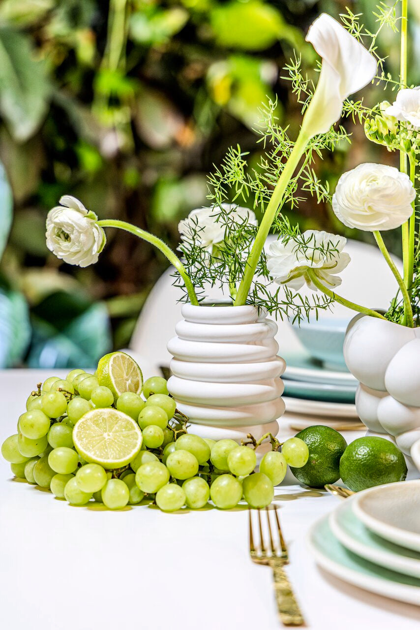 Gefertigt aus hochwertigem Porzellan und in einem eleganten mattierten Weiß gehalten, überzeugt die Vase durch ihre klare, puristische Ausstrahlung. Das edle Material sorgt für eine angenehme Haptik und unterstreicht den hochwertigen Charakter dieses exklusiven Wohnaccessoires.